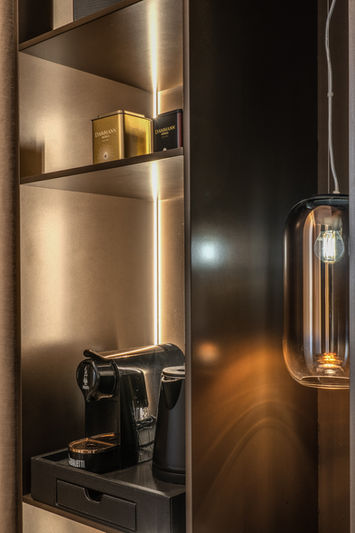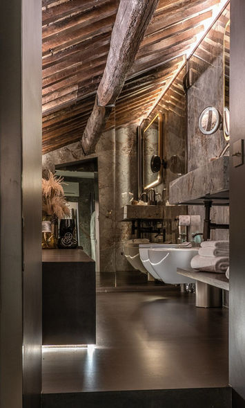 The interior design of the Hotel Eitch Borromini is based on a rich materiality: polished marble with natural veins, porous white travertine, warm-toned oak parquet and exposed wooden beams interact with soft velvets, tactile fabrics and burnished metals. The surfaces, alternating between glossy and matt, smooth and rough contrasts, are emphasised by carefully designed lighting, creating environments that combine the solidity of tradition with the refinement of contemporary luxury
